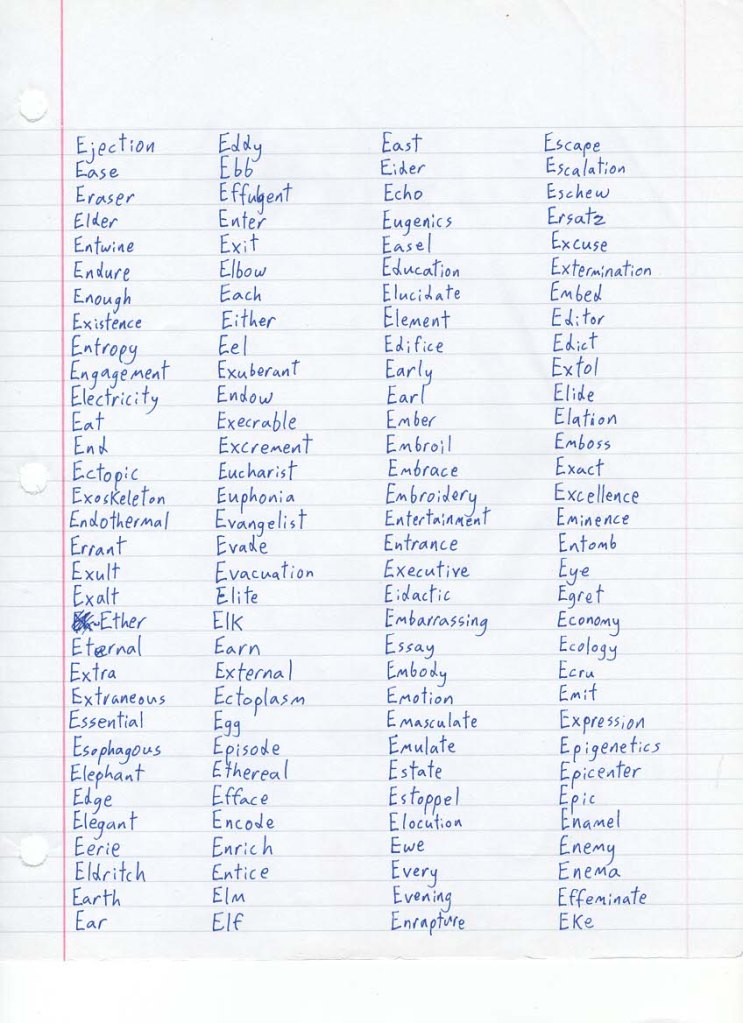 Welcome back to my weekly series, Vocab 128, in which I sit down with pen and paper and write 128 words beginning with the same letter, in more or less the order that I think of them, before scanning the page and posting it here. The result is a flex of my vocabulary muscles, an exposure of my handwriting to the world, and perhaps an insight into the psychology of my word associations.