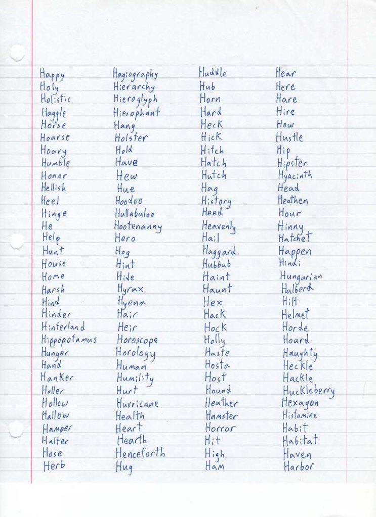 Welcome back to my weekly series, Vocab 128, in which I sit down with pen and paper and write 128 words beginning with the same letter, in more or less the order that I think of them, before scanning the page and posting it here. The result is a flex of my vocabulary muscles, an exposure of my handwriting to the world, and perhaps an insight into the psychology of my word associations.