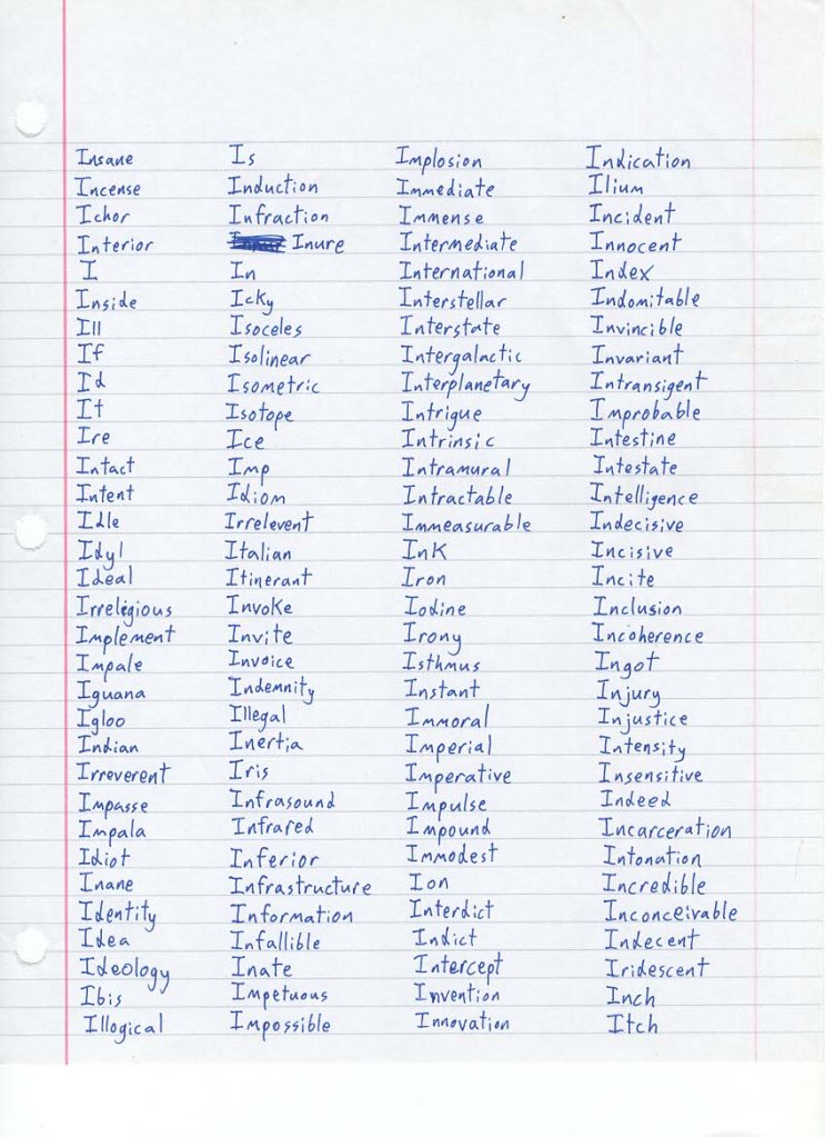 The word “incest” popped into my head while I was gathering pen and paper, and then I simply forgot to write it down. The same goes for “insect.” The problem, I say, is that so many of these “I” words sound the same.