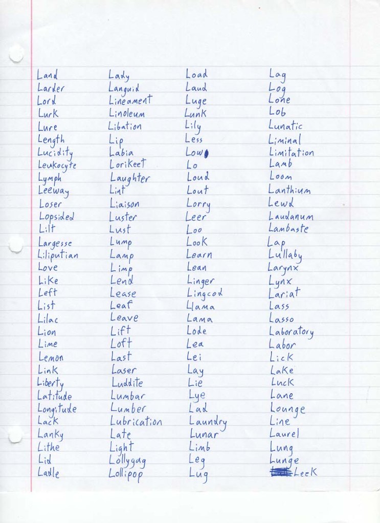 I wrote “lull” for my last word, and then I got a pang of conscious as to whether it was the “same word,” according to my arbitrary standards, as “lullaby.” It’s not, but I thought of a bunch of alternatives, and the first one was “leek.”