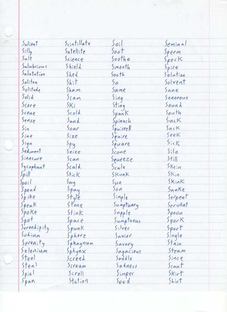 Welcome back to my weekly series, Vocab 128, in which I sit down with pen and paper and write 128 words beginning with the same letter, in more or less the order that I think of them, before scanning the page and posting it here. The result is a flex of my vocabulary muscles, an exposure of my handwriting to the world, and perhaps an insight into the psychology of my word associations.
