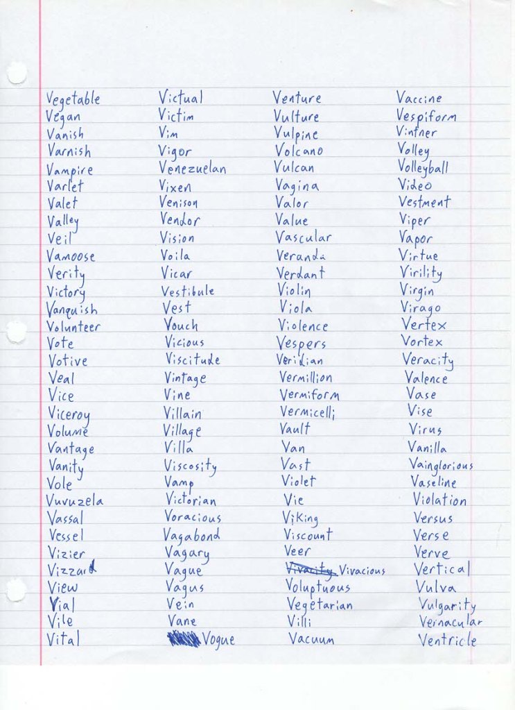 Words I most wish I had remembered before I finished (and replaced some of these embarrassments): “vehicle,” “vanguard,” either “vermin” or “varmint,” and “venereal.”